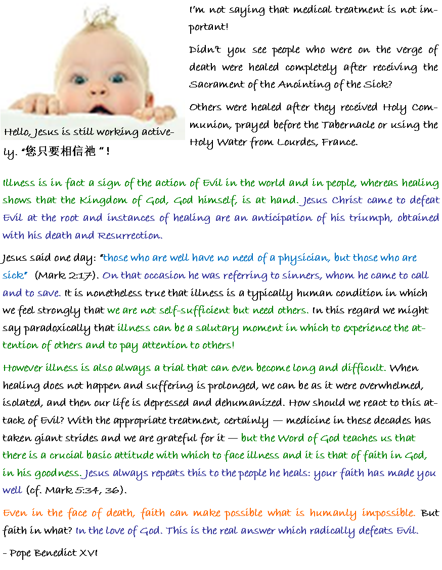 However illness is also always a trial that can even become long and difficult. When healing does not happen and suffering is prolonged, we can be as it were overwhelmed, isolated, and then our life is depressed and dehumanized. How should we react to this attack of Evil? With the appropriate treatment, certainly — medicine in these decades has taken giant strides and we are grateful for it — but the Word of God teaches us that there is a crucial basic attitude with which to face illness and it is that of faith in God, in his goodness. Jesus always repeats this to the people he heals: your faith has made you well (cf. Mark 5:34, 36).